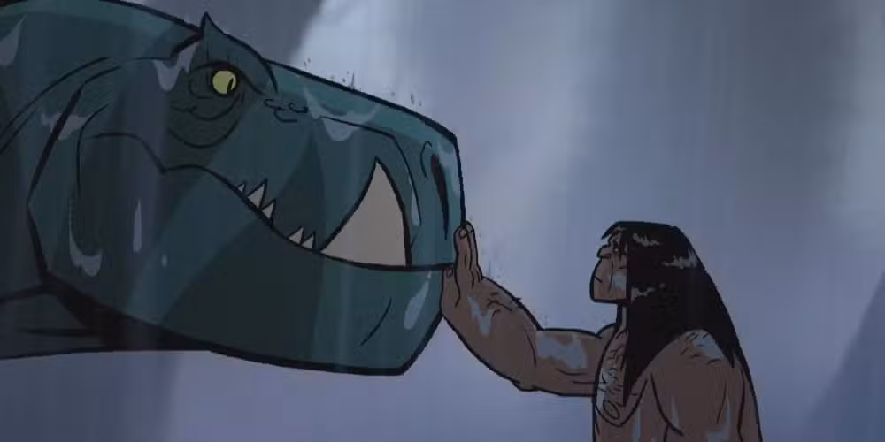 La primera temporada fue notable porque casi no usó diálogo, con la temporada 2 trayendo cantidades limitadas para sacudir las cosas. Esto forzado Primitivo Para confiar en sus imágenes más que nada, y la comunicación no verbal entre sus personajes principales, la lanza de Neanderthal y el Fang de T. Rex, que se unen en el primer episodio después de que ambos experimentan una pérdida traumática.