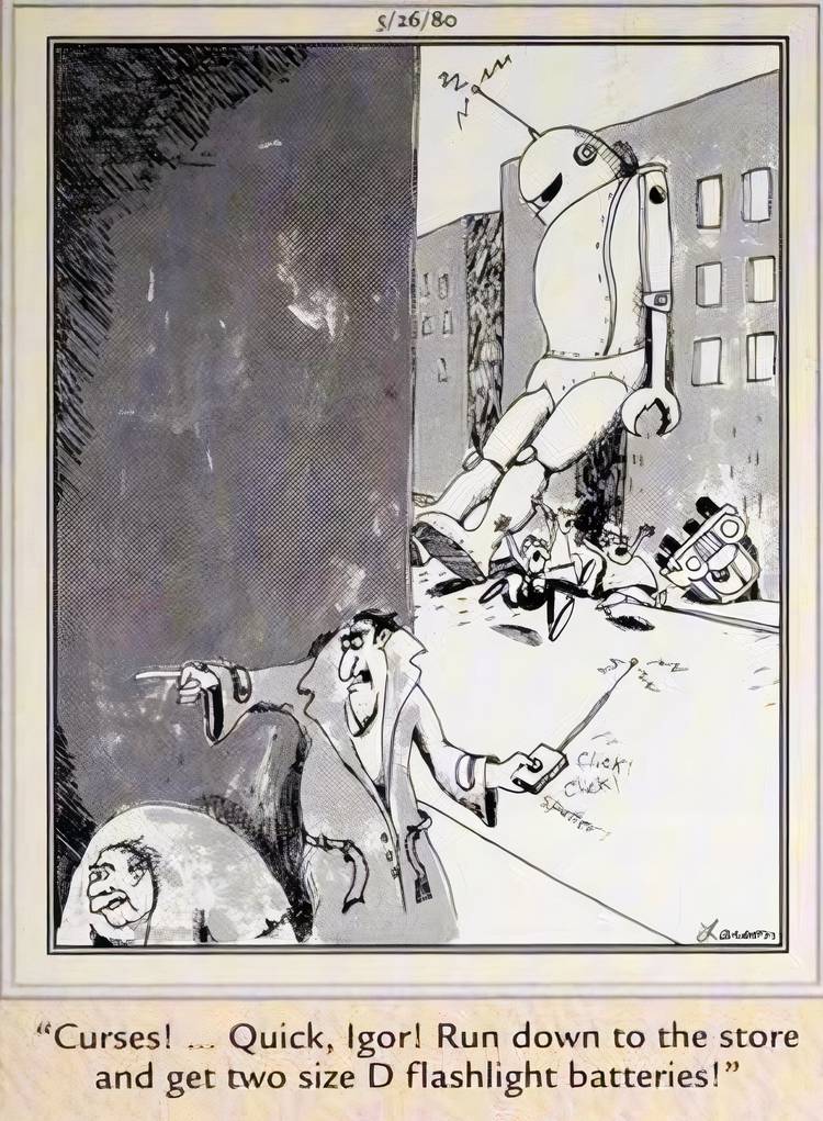El Dr. Frankenstein y su asistente de laboratorio Igor son dos de El lado lejano personajes recurrentes más divertidos y queridosgeneralmente atrapado en los experimentos mal aconsejados e interminables de Frankenstein y otras travesuras generales. En esta franja, el humor proviene de Frankenstein tratando de hacerse cargo de una ciudad con su robot, solo para que la máquina gigante se estrellen cuando mueran las baterías.