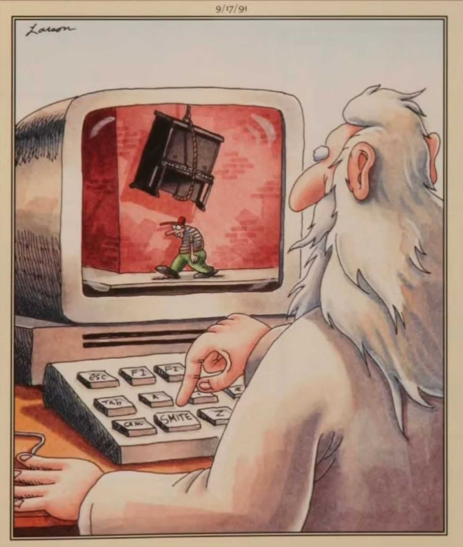 El lado lejano La versión de Dios es uno de los personajes más hilarantes y queridos de Larson, a menudo aparecidos en escenarios irónicos sobre cómo opera el cielo. En este cómic, Dios usa una computadora para llevar a cabo sus deberes divinospresionando un “Herir” clave ubicada justo al lado del “Z” llave.