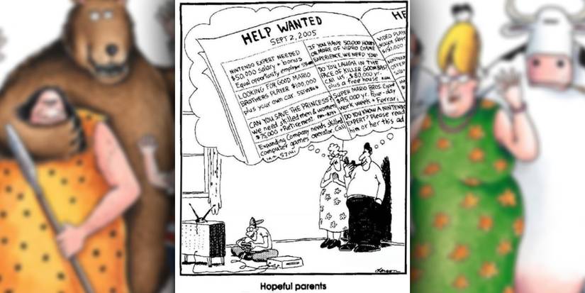 Quizás una de las tiras cómicas más conocidas y aludidas de Larson cuando se trata de predecir el futuro es su panel único Padres esperanzados. Este lado lejano Comic muestra a un niño encorvado y completamente absorto en su videojuego. Sus padres miran desde el fondo, sus burbujas de pensamiento muestran “Se busca ayudante” Anuncios con trabajos altos para jugadores de videojuegoscon referencias específicas a Nintendo’s Mario hermanosque era extremadamente popular en ese momento.