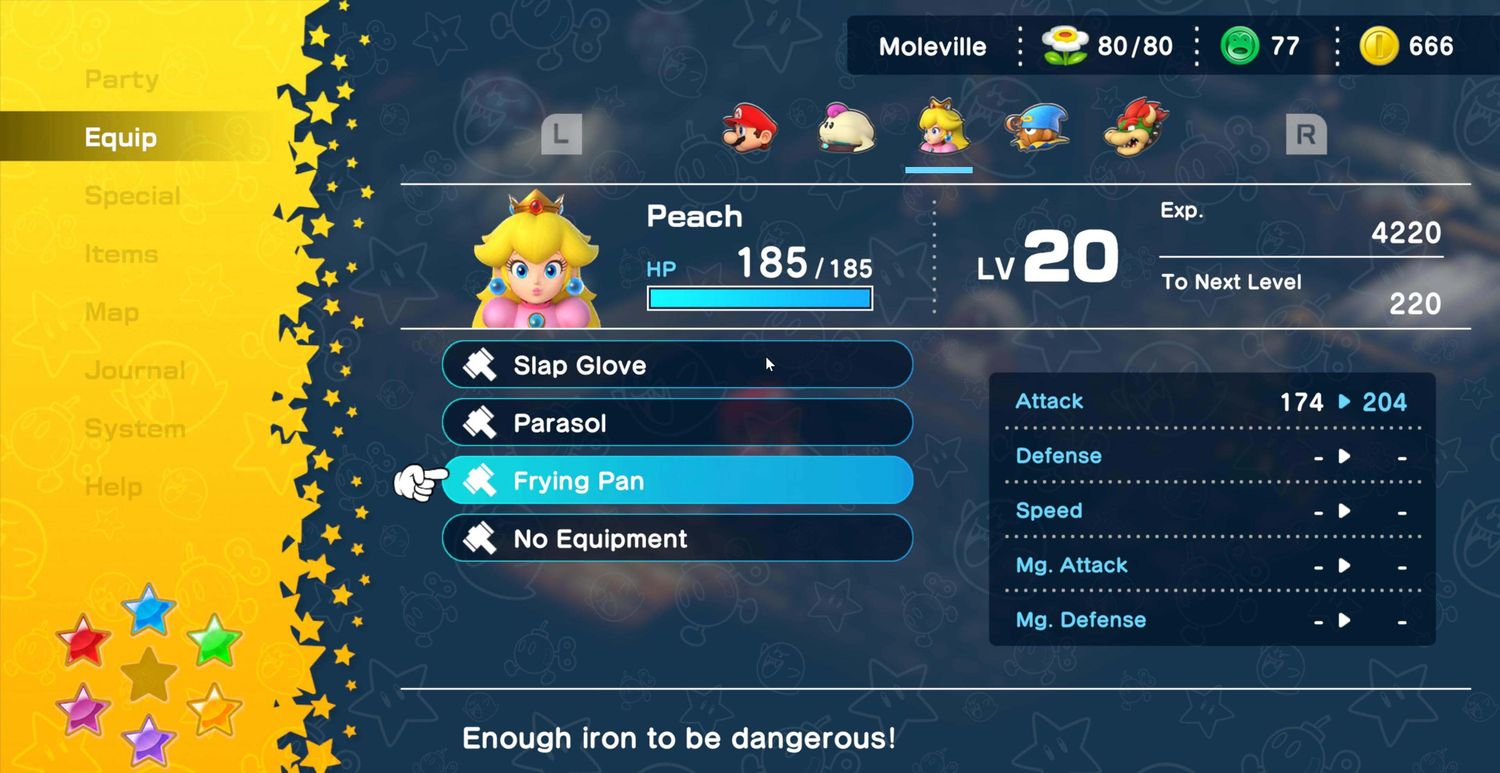 Además, al subir de nivel, también tienes la opción de qué estadísticas específicas aumentar. Esto incluye físico, puntos de golpeo magia. Los cinco personajes jugables principales tienen sus fortalezas y debilidades, y roles importantes en el grupo. Es posible que te sientas inclinado a centrar las estadísticas en personajes concretos. Después de todo, Bowser utiliza más ataques físicos y Malva favorece la magia. Sin embargo, ciertos niveles generan estadísticas de bonificación adicionales para un aumento seleccionado. Una buena regla general es comprobar las tres posibilidades, cancelarlas y luego confirmar sólo la mejora más alta.