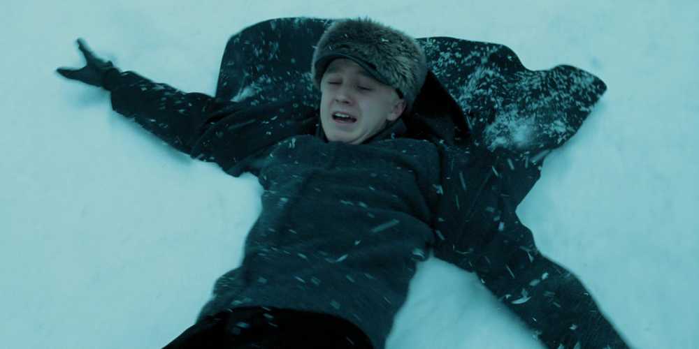 En la película, Harry usa la capa para visitar Hogsmeade, donde encuentra a Malfoy, Crabbe y Goyle jugando con Ron y Hermione. Harry decide ayudar a sus amigos arrojando bolas de nieve a Malfoy and Company, arrastrándolas en la nieve y más, y no tienen idea de lo que está sucediendo.