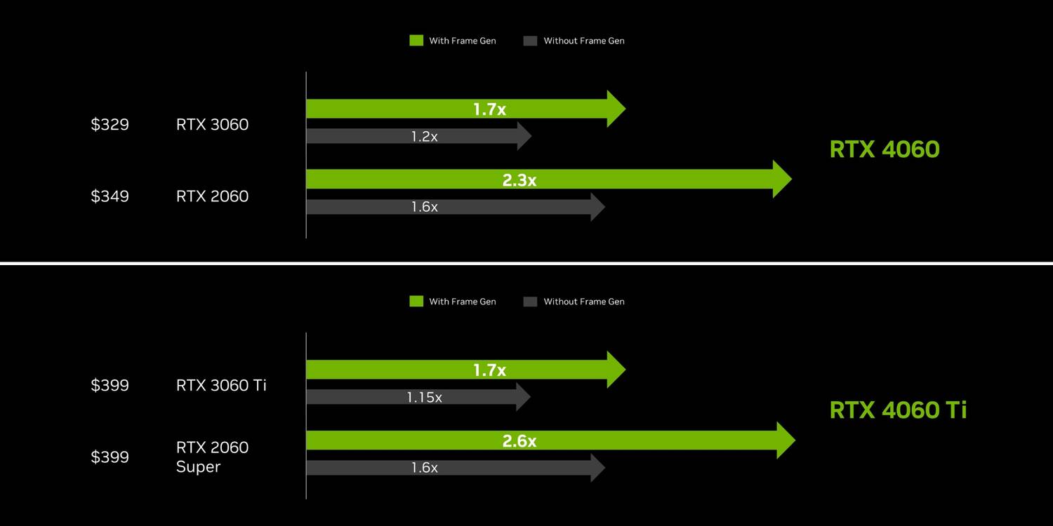 Los últimos procesadores gráficos de Nvidia ofrecen una mejora significativa con respecto a sus predecesores. La RTX 4060 ofrece un rendimiento hasta 1,7 veces mejor que la RTX 3060 con Frame Gen. Del mismo modo, la RTX 4060 Ti ofrece un rendimiento hasta 1,7 veces mejor que la RTX 3060 Ti. Con más núcleos CUDA, la 4060 Ti puede reproducir más videojuegos a más de 100 fotogramas por segundo a 1080p.