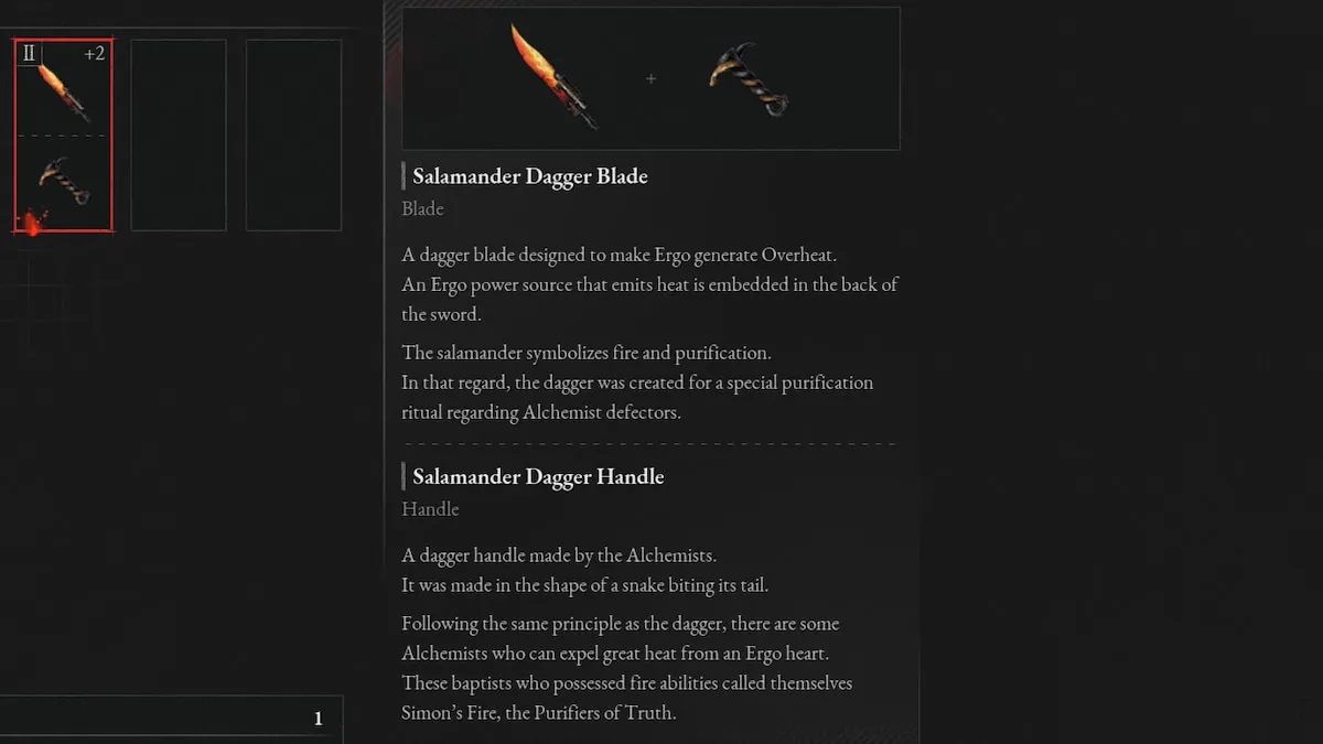 El arma completa es buena por sí sola, pero se vuelve aún mejor cuando se combina con otros mangos elementales o de escala avanzada. Considerar Mango de lanza de cristal ácido para mayor alcance, Gran mango de espada curvado y ácido por puro poder, o el Mango de motosierra eléctrica circular para una mejor vigilancia. La propia Salamander Dagger Blade tiene la Encender Arte de fábula. Esto causará daño adicional basado en el fuego, pero no producción física.