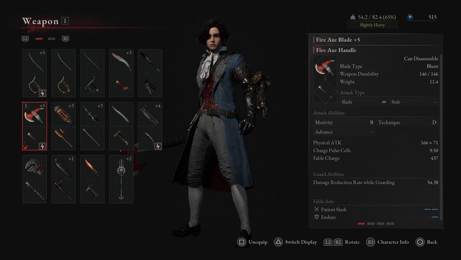 El mango tiene escala C tanto con Motividad como con Técnica, lo que lo convierte en una excelente opción para muchas hojas. Considere combinarlo con otros cabezales similares como el Hoja de pala militar, Hoja de alabarda del caballero malditoo Hoja de sable de marioneta. El mango también otorga la Perdurar Fable Art, que puede evitar sufrir daños y quedar tambaleado por un corto período de tiempo.