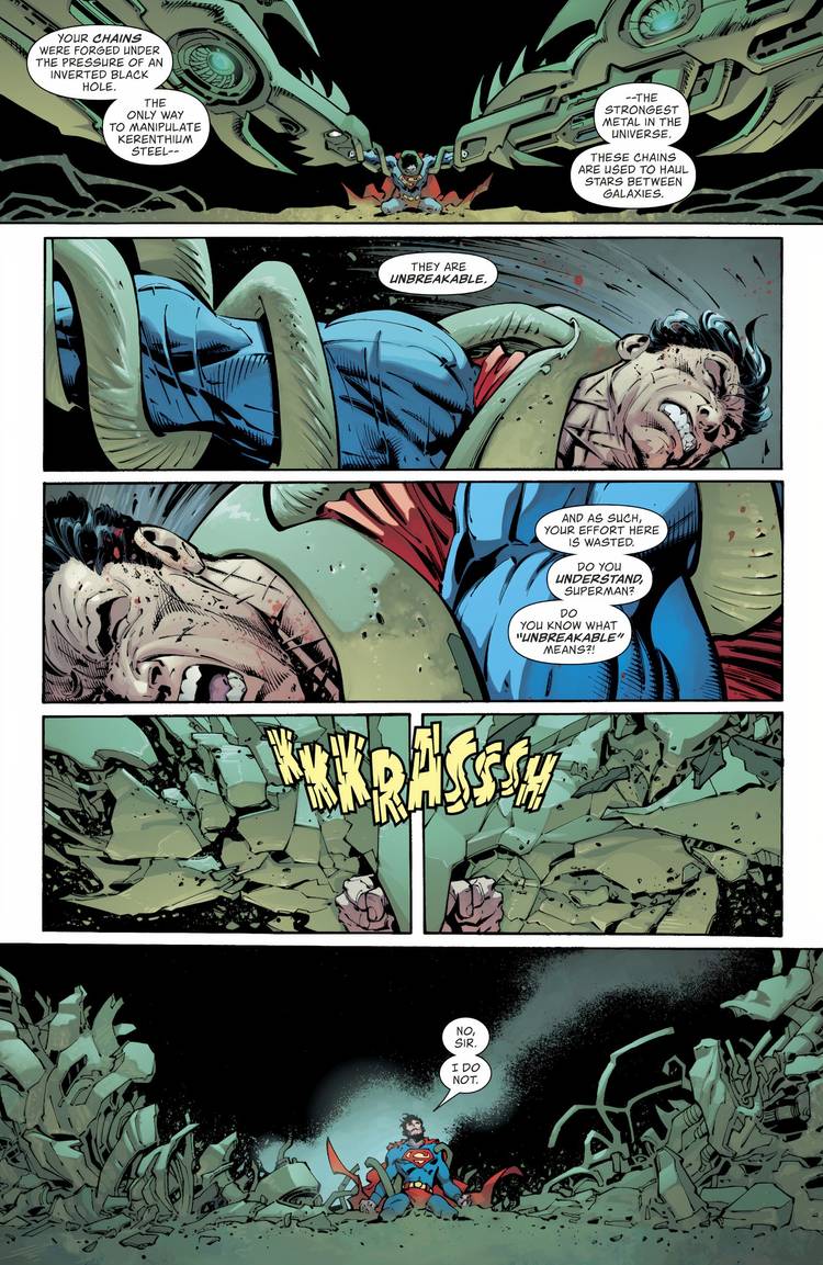 El científico se burla de Superman y le pregunta si sabe lo que significa irrompible, a lo que Superman simplemente responde con “No señor, yo no” mientras rompe el acero circundante. Si eso no fuera lo suficientemente rudo, Superman sigue esta hazaña destruyendo un batallón de máquinas que actualmente están derrotando a todos los héroes de la Tierra. A pesar de su poder aparentemente abrumador, Superman los destruye a todos por su cuenta. Cruza el universo entero solo para salvar a una niña, una niña que el científico insiste en que no vale nada, pero Superman sabe que nadie es inútil y que vale la pena salvar a todos.