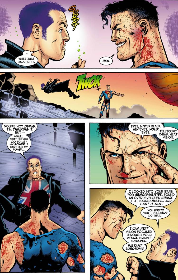 Con estos tres combinados, Superman destruye instantáneamente la parte del cerebro de Manchester que le permite usar sus poderes. En un instante, Manchester perdió sus habilidades y se vio obligado a rendirse a Superman. Superman no suele cruzar esta línea, pero para demostrarlo, tenía que demostrar lo peligroso que podía ser en realidad.