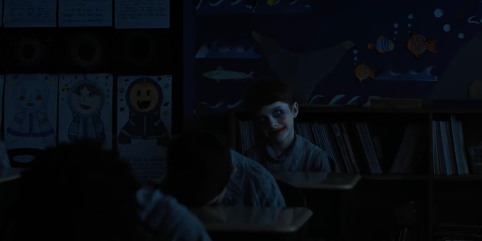 En ese momento, el niño se parece a otro personaje que aparece en el trailer, que se ríe mientras usa maquillaje similar. Esto implica que este estudiante no fue tomado porque estaba trabajando con el secuestrador todo el tiempo.
