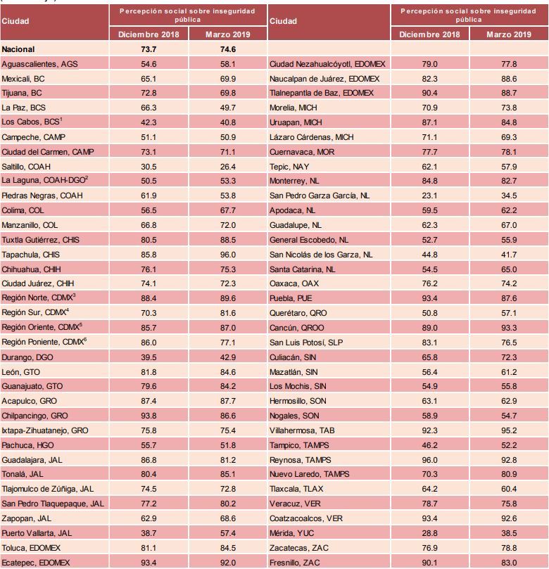 La información del organismo indica que en ciudades como Colima, Tapachula, Ciudad de México (región sur), Puerto Vallarta, San Pedro Garza García y Nuevo Laredo, la percepción de inseguridad subió por arriba de 10 puntos, respecto a diciembre de 2018.