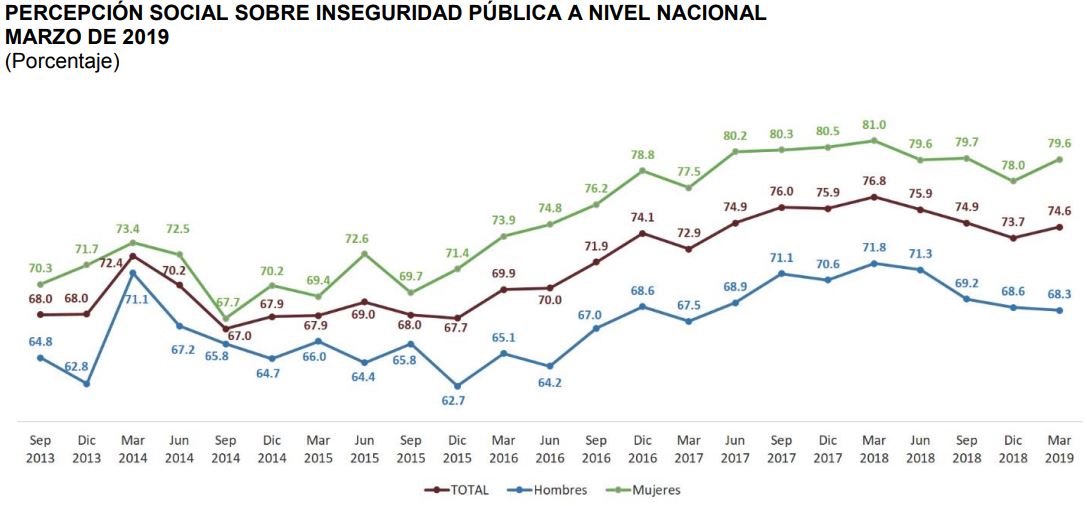 La encuesta arrojó que la percepción de inseguridad siguió siendo mayor en el caso de las mujeres con 79.6 por ciento, mientras que para los hombres fue de 68.3 por ciento.