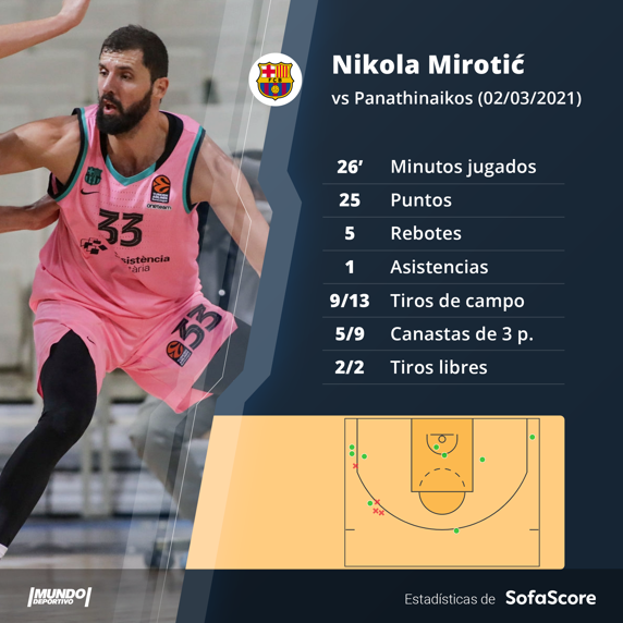 El primero fue un cuarto de reafirmación de Mirotic y el Barça ante un Panathinaikos dispuesto a entregar el mando a Hezonja. El hispano-montenegrino dio toda una lección de eficacia al croata con canastas de todas las facturas, incluidos tres triples, que dieron el mando a un Barça fluido en ataque y algo lento en la defensa del juego interior.