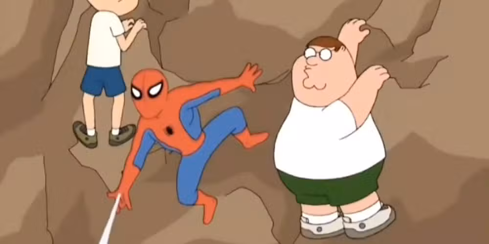 Spider-Man ha aparecido en Padre de familia varias veces, y el espectáculo consistentemente lo usa para remates rápidos y surrealistas. Su cameo más divertido ocurre en “Let’s Go to the Hop”, donde Peter Griffin se cae del techo en un accidente de payasada. Justo cuando parece que está a punto de caer al suelo, Spider-Man aparece y lo rescata.