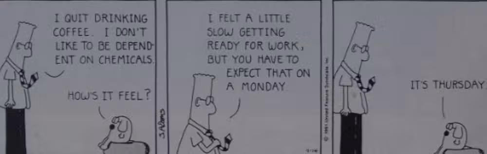 “es jueves“, responde Dogbert inexpresivamente. Cualquiera que haya intentado reducir su consumo de cafeína durante una semana laboral puede identificarse con este chiste. Son chistes como este los que ayudaron a Scott Adams Dilberto Ganó atención y saltó a la fama a principios de la década de 1990, al inicio de su publicación.