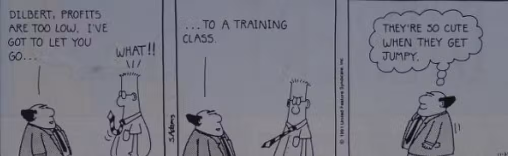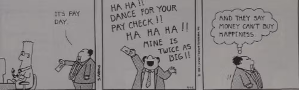 “Baila por tu cheque“, le grita el jefe de pelo puntiagudo a Dilbert, riendo como un maníaco mientras declara “el mio es el doble de grande” Este retrato de los mandos intermedios de una empresa como completamente obtusos y carentes de conciencia sobre su relación con sus empleados es exactamente el tipo de humor que la oficina Más tarde se perfeccionaría en la década de 2000.