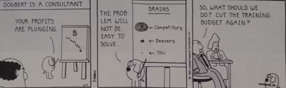 Al llegar a la oficina de Dilbert como consultor, Dogbert intenta, sin éxito, hacerle entender al jefe de pelo puntiagudo que él y sus empleados están trabajando con cerebros más pequeños que “castores“, mientras que su “competidores” son considerablemente más inteligentes. Como era de esperar, PHB extrae precisamente la lección equivocada de esto y sugiere como respuesta una menor capacitación para su personal.