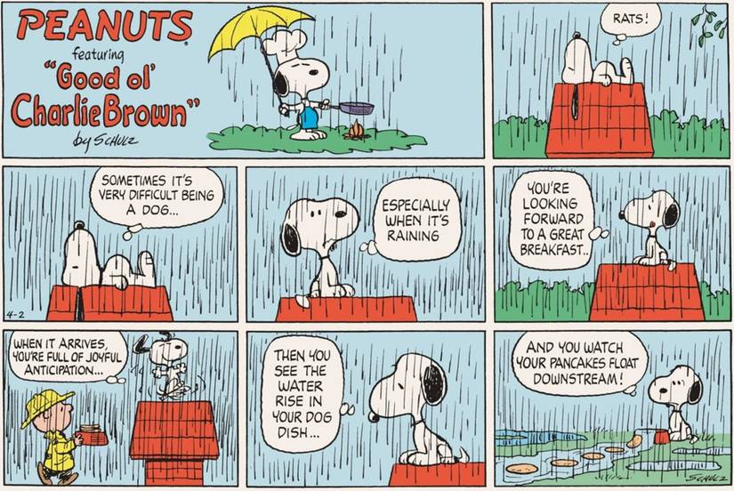 Snoopy contempla las dificultades de ser un perro cuando llueve sobre él. Una de las mayores dificultades ocurre cuando Snoopy ha estado esperando con entusiasmo su desayuno, encantado cuando su comida finalmente se le sirve. Sin embargo, la alegría se convierte en decepción y horror cuando ve Agua llenando su tazón de cena y los panqueques que ha estado esperando flotar en el agua que se avecina río abajo. Por mucho que a Snoopy le encanta comer Miseriaes increíblemente molesto para él cada vez que algo le sucede a su comida.