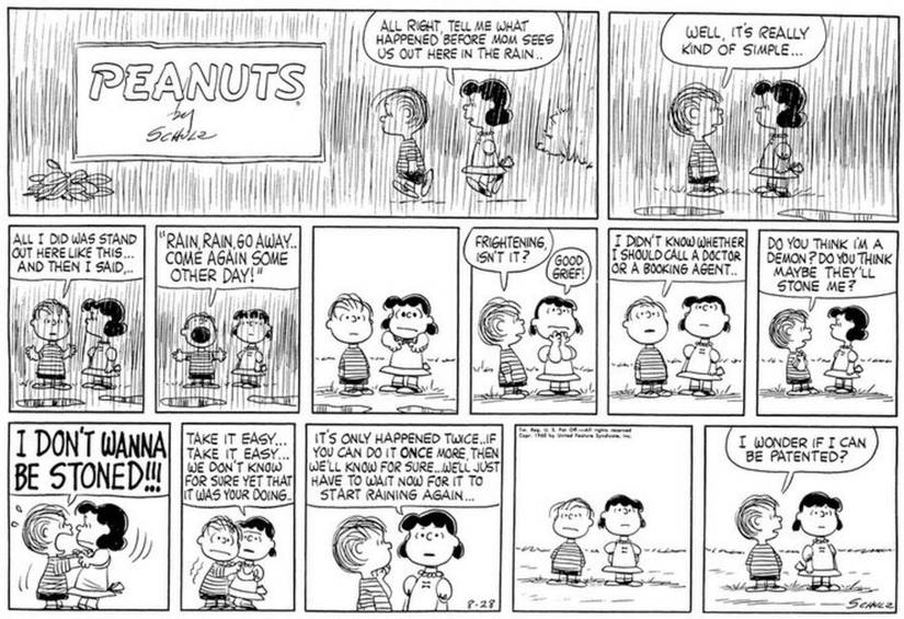 Lucy asigna a Linus a demostrar su regalo especial antes de que su madre los vea destacando bajo la lluvia. Linus muestra que todo lo que hace es decir la rima de “lluvia, lluvia, desaparecer”, y la lluvia desaparece mágicamente, al asombro y el miedo de Lucy. Linus sabe que da un poco de miedo que sea capaz de hacer tal cosa, cuestionando si su regalo es algún tipo de condición médica o una Ley de Vegas capaz de vender asientos. Linus luego se preocupa de que tal vez la gente piense que él es un demonio y lo piedra de él debido a sus talentos que destruyen la lluvia, pero Lucy lo calma cuando razona que solo ha sucedido dos veces, por lo que puede ser una coincidencia.