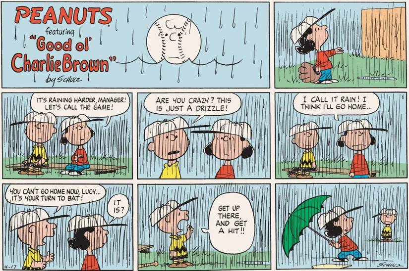 Al principio, Lucy actúa como si fuera a Charlie Brown a lograr un avance terapéutico, pero En realidad, se queja de la lluvia. Charlie Brown parece tener una mente de una pista cuando se trata de béisbol, nunca dejando un juego para lluvia, aguanieve o nieve. Solo ha habido un puñado raro de ocasiones de que Charlie Brown se ha perdido un juego de béisbol, y solo está ausente de los juegos cuando es absolutamente necesario, ya que esta tira muestra que la lluvia no es una razón suficiente para que él lo haga.