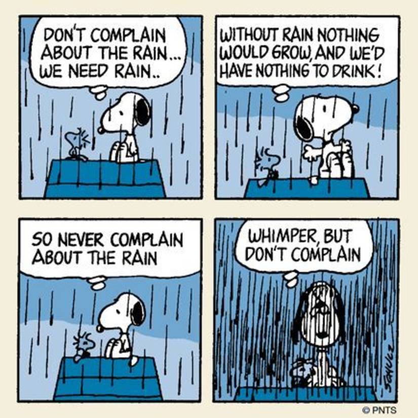 Snoopy aconseja a Woodstock que no se queje de la lluvia, porque la tierra necesita la lluvia para que las cosas crezcan y tomen agua para beber. Cuando la lluvia empeora aún más Snoopy le dice a Woodstock que pueden gemir bajo la lluvia, pero no se quejarán. La lluvia es importante para que la tierra y para que los humanos (perros y pájaros) prosperen, algo que Snoopy definitivamente entiende. Sin embargo, no siempre le gusta que no pueda quejarse de la lluvia torrencial, conformándose con un buen gemido en lugar de una queja absoluta.