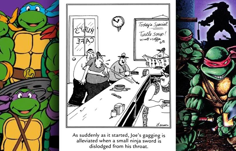 Este cómic muestra cómo, a pesar de usar solo un solo panel, Gary Larson a menudo hace que sus lectores funcionen para el frasio, con varios detalles combinados para explicar lo que está sucediendo en este cómic, desde la pequeña espada y la máscara hasta el tablero que indica que la tortuga especial de hoy es la tortuga de hoy. sopa.