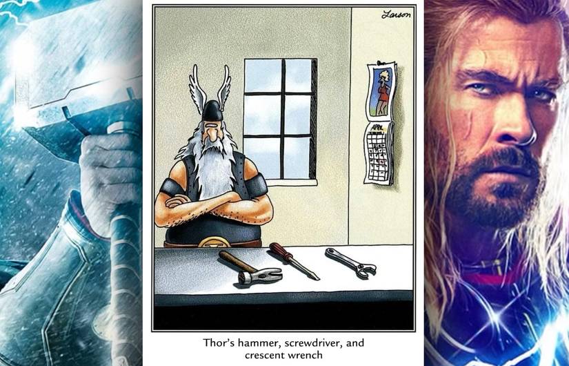 De Larson Lado lejano Se imagina que el martillo de Thor es solo parte de un conjunto más grande de herramientas, que muestra al dios del trueno posando junto a su colección con aparente orgullo. El calendario en la pared se suma a la presentación divertida cotidiana del Dios poderoso, mientras que la pose recuerda extrañamente al icónico cómico ‘Herramientas de vacas’ de Larson, otra franja donde un personaje inusual está inexplicablemente orgulloso de sus herramientas.