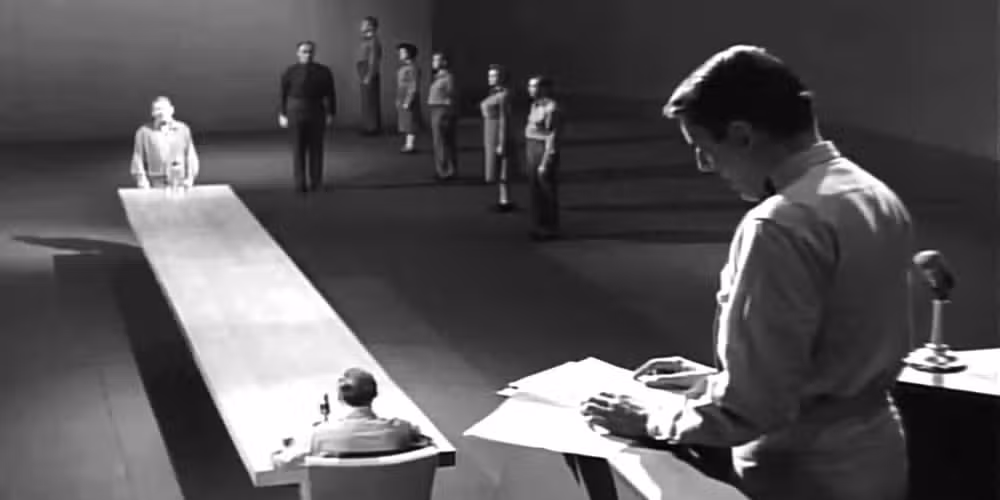 Escrito por Rod Serling y dirigido por Elliot Silverstein, “The Obsolete Man” lleva a la audiencia a un futuro gobernado por un gobierno totalitario. En él, el bibliotecario Romney Wordsworth (Burgess Meredith) se considera “obsoleto”, ya que el estado ha eliminado los libros. Debido a esto, y debido a su fe en Dios, como el estado ahora es ateo, Romney es sentenciado a muerte.