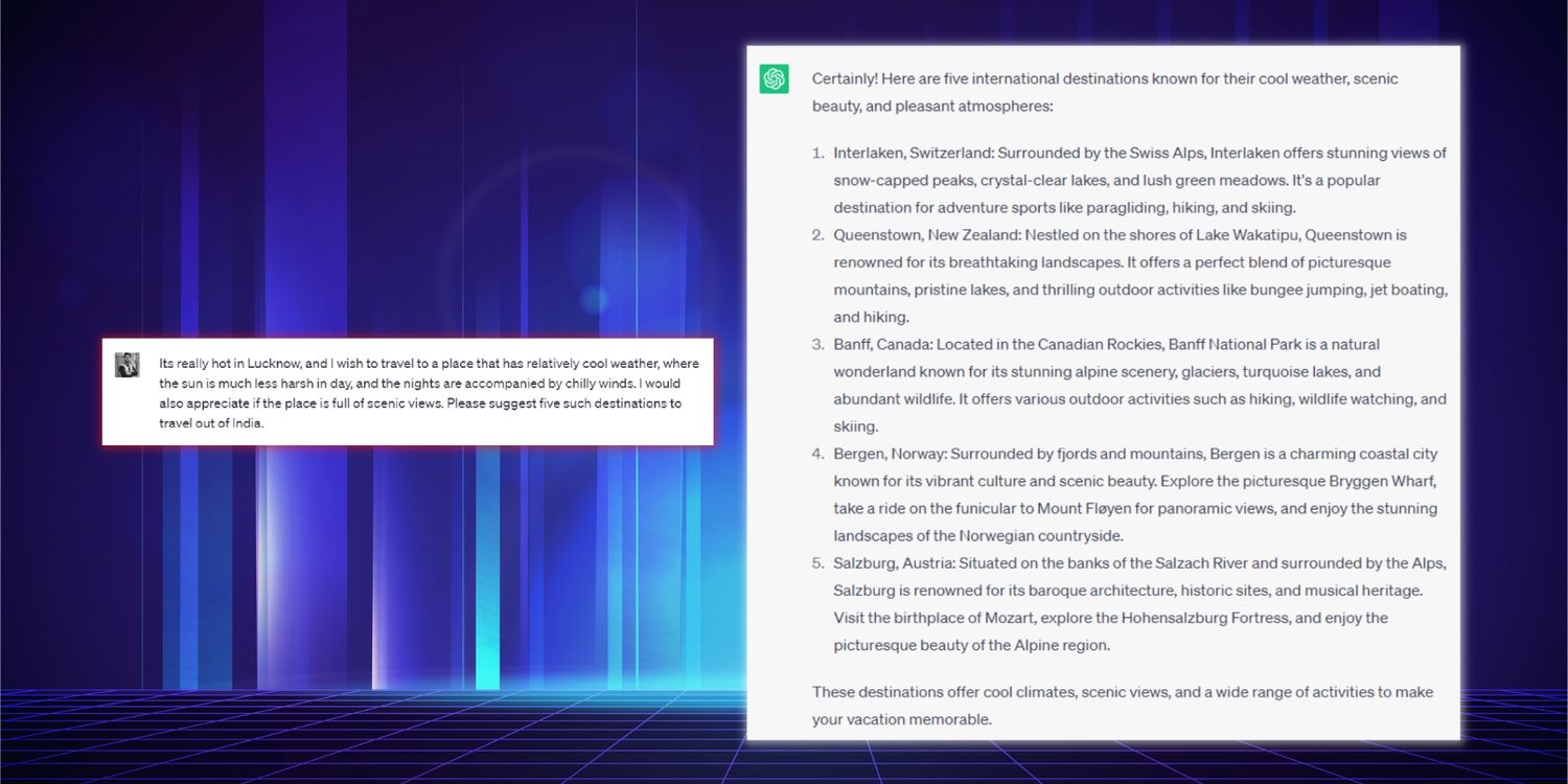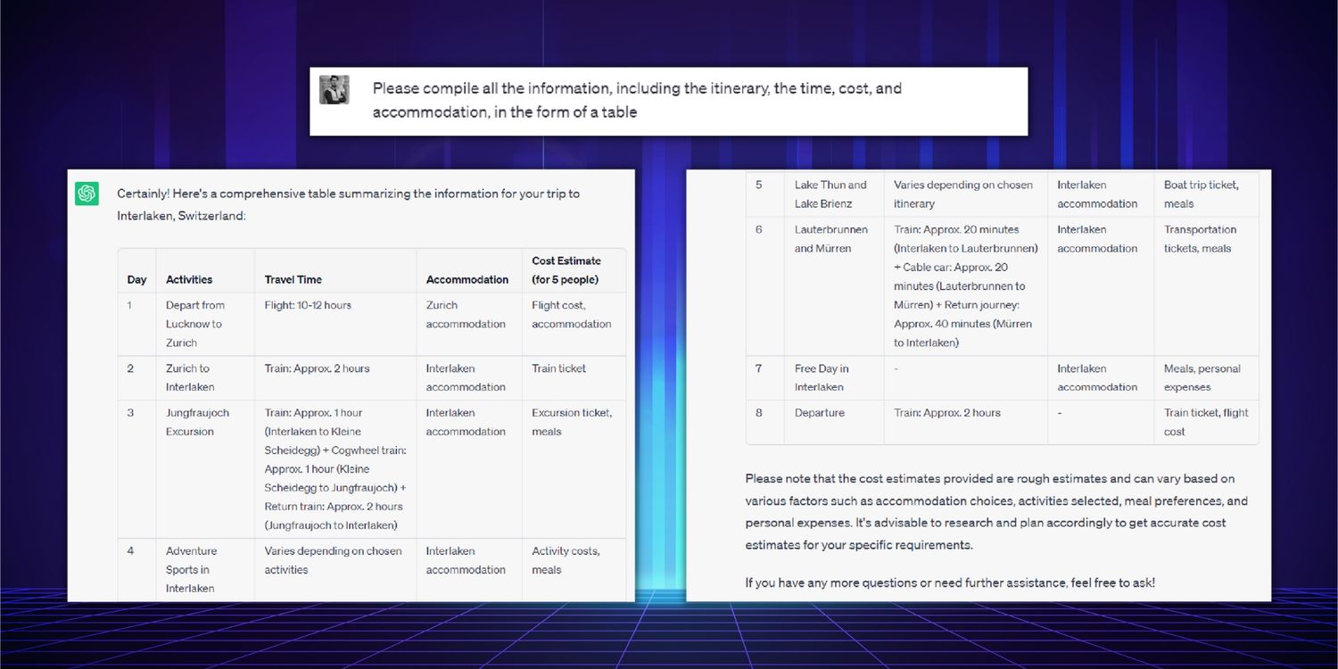 Para este ejemplo en particular, el itinerario contenía toda la información requerida, pero una vez más, parte de ella parecía un poco incorrecta, por lo que los usuarios siempre deben verificarla nuevamente. Por ejemplo, el modelo lingüístico dice que un vuelo desde Lucknow, Uttar Pradesh, India, a Zurich, Suiza, tarda de 10 a 12 horas, mientras que el vuelo más rápido disponible ahora tarda más de 13 horas. Sin embargo, la hora aproximada de Zúrich a Interlaken es correcta.