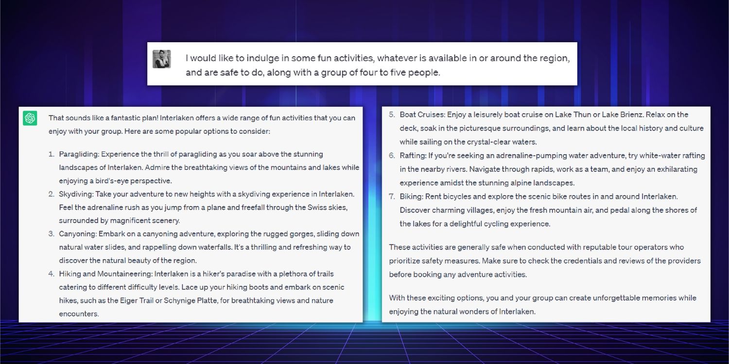 Le pidió a ChatGPT que sugiriera algunas actividades divertidas disponibles en la región o sus alrededores y, lo que es más importante, aquellas que sean seguras para realizar con un grupo de cuatro o cinco personas. En su respuesta, el modelo de procesamiento del lenguaje incluía cosas como parapente y paracaidismo, que definitivamente son más para quienes buscan emociones fuertes. Otras actividades que sugirió incluyen senderismo, cruceros en barco, rafting y ciclismo a lo largo de las rutas panorámicas de Interlaken y sus alrededores. ChatGPT también pide a los usuarios que verifiquen las credenciales y reseñas de los proveedores turísticos que realizan estas actividades para tener una mejor idea de cómo podrían ser las experiencias.
