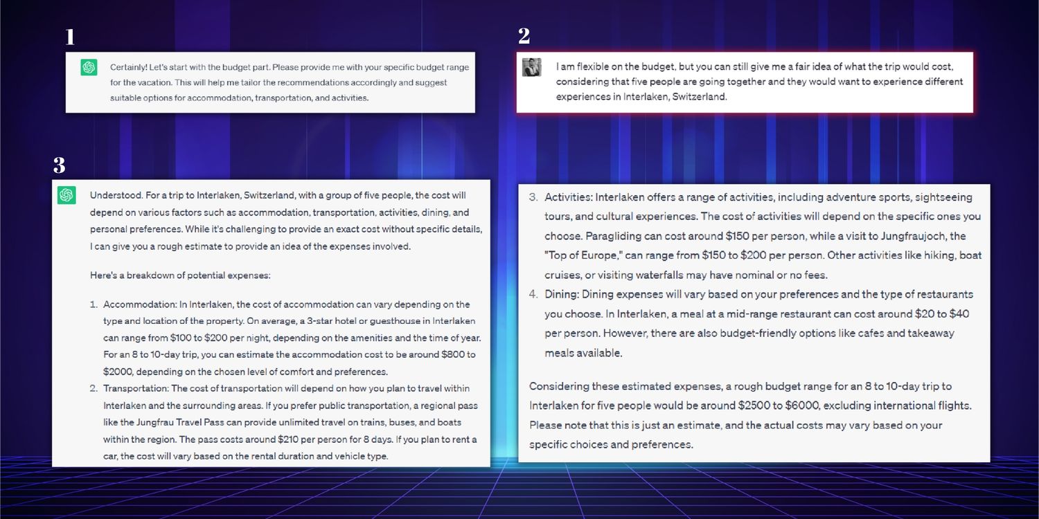 Para comenzar a planificar sus gastos para el viaje, ChatGPT le pedirá el “rango de presupuesto específico para las vacaciones.” En esta etapa, los usuarios deben ingresar su presupuesto para el viaje, si lo tienen, o preguntar al chatbot sobre el costo aproximado de un viaje al lugar para dicho número de personas. El chatbot tendrá en cuenta factores que incluyen alojamiento, transporte, actividades, comidas y preferencias personales, en este caso concluyó que el viaje podría costar entre $2,500 y $6,000, excluyendo vuelos internacionales.