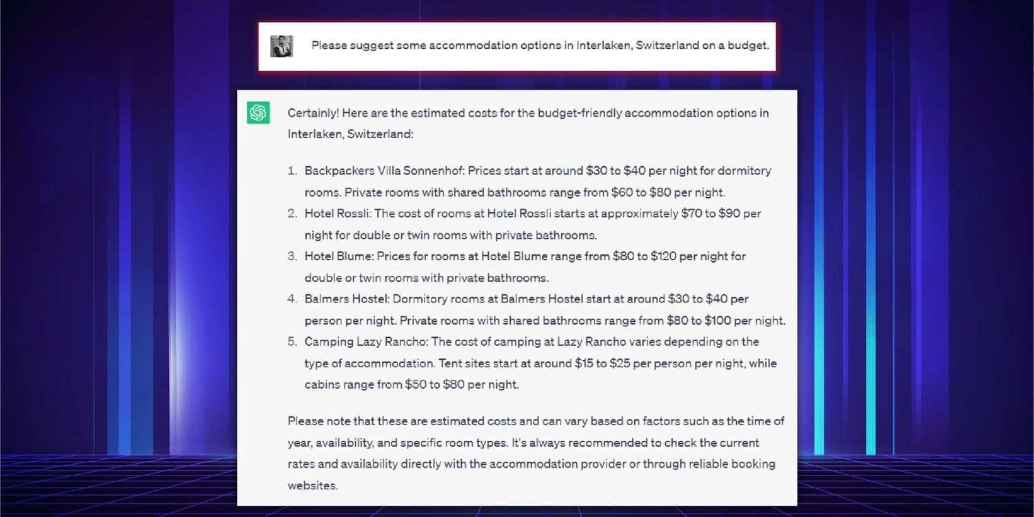 ChatGPT también puede sugerir a los usuarios algunas de las opciones de alojamiento más conocidas. Al escribir el comando, “Por favor sugiera algunas opciones de alojamiento en Interlaken, Suiza, con un presupuesto limitado.“Al chatbot se le ocurrieron varias opciones. Aunque acertó con el nombre de los lugares, el rango de precios estimado que mostró era diferente de los precios reales disponibles en línea. En su respuesta, ChatGPT incluye eso “Estos son costos estimados y pueden variar según factores como la época del año, la disponibilidad y tipos de habitaciones específicos.“Por lo tanto, aunque los usuarios puedan obtener algunas recomendaciones, siempre es mejor verificar la información para tener una idea exacta.