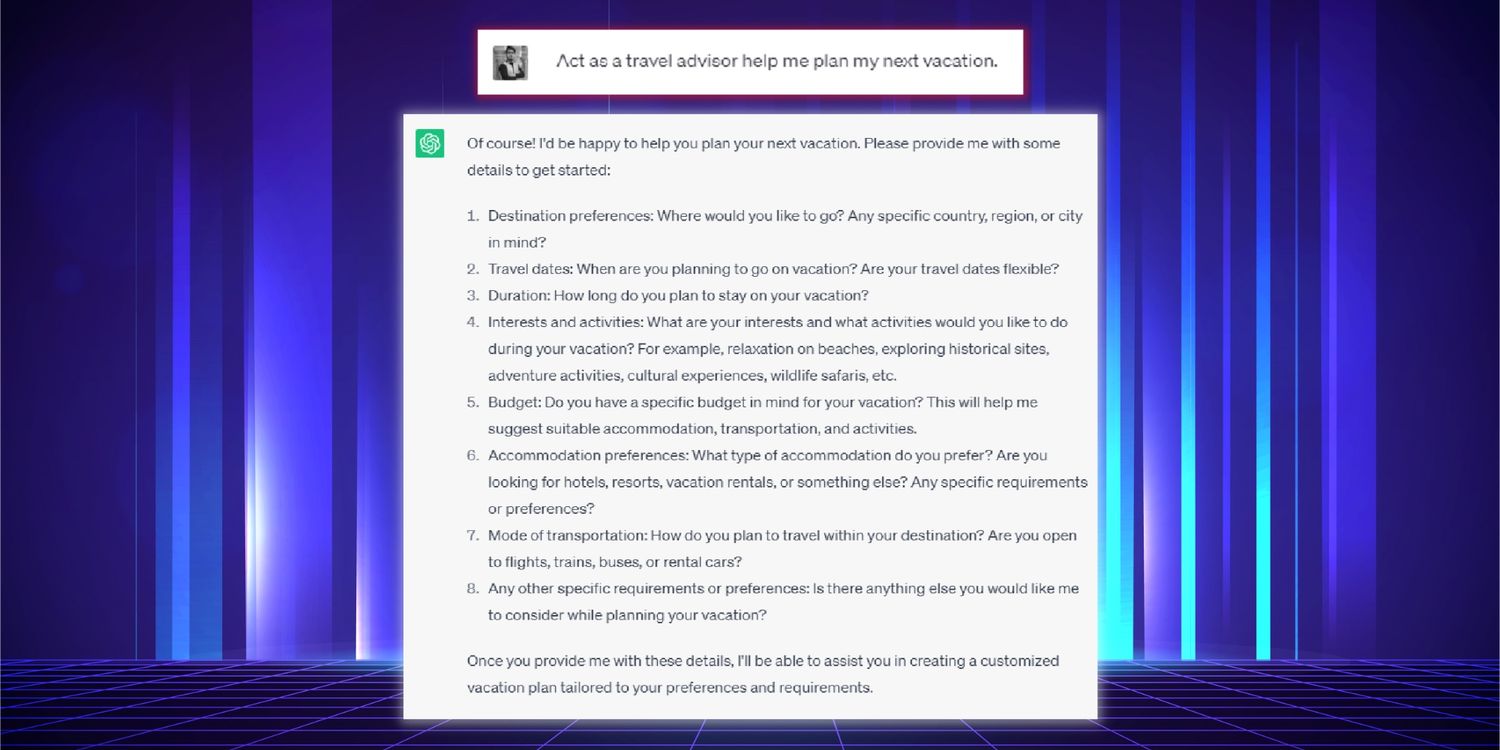 Lo primero que deben hacer los usuarios es pedirle a ChatGPT que actúe como asesor de viajes. Dado que la herramienta es capaz de elegir diferentes estilos y tonos de conversación, pedirle que hable como un asesor de viajes ayuda a establecer un contexto y obtener resultados relevantes. Al ingresar al mensaje, “Actuar como asesor de viajes para ayudarme a planificar mis próximas vacaciones.” la herramienta responde “¡Por supuesto! Estaré encantada de ayudarte a planificar tus próximas vacaciones.” A continuación, la herramienta de procesamiento del lenguaje formula preguntas para ayudar a los usuarios a planificar sus vacaciones, empezando por las preferencias de destino, las fechas de viaje, la duración, los intereses y actividades, el presupuesto y otras cosas importantes.