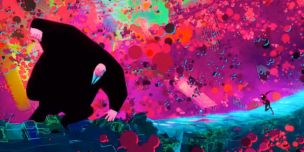 La escena culminante de la pelea es la demostración perfecta de cómo el Spider-Verso La franquicia se apoya en la fuerza de la animación como medio. El espacio en el que Kingpin y Miles pelean cambia constantemente de tamaño y forma, hay explosiones regulares de color, un tren entero lo atraviesa en un punto y, sin embargo, está dentro del piso de un rascacielos.