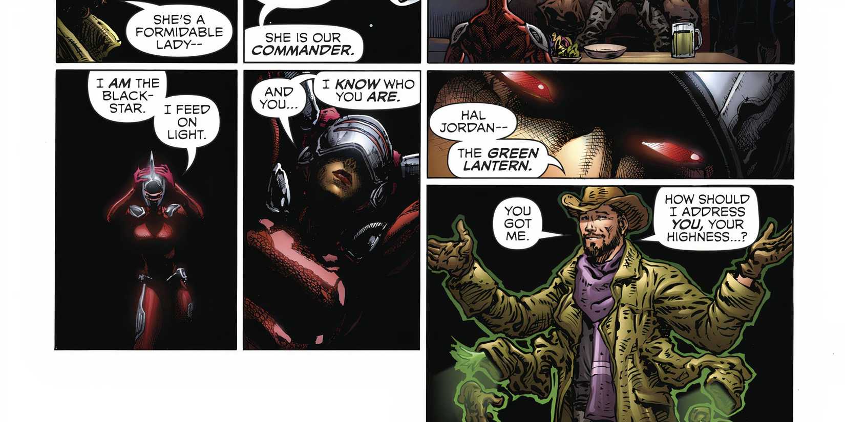 Las linternas verdes son, más o menos, las fuerzas de paz, y a veces tienen que ir encubiertas para llegar al fondo de las cosas. En La linterna verde #4Hal está buscando las estrellas negras y entabla una conversación con la condesa Belzebeth. Para ocultar su identidad, Hal genera un par de brazos adicionales para que parezca más ‘alienígena’.