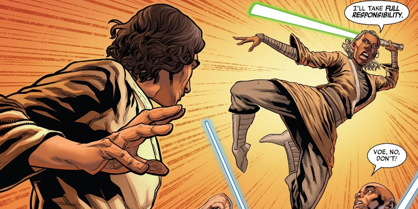 Uno de los tres aprendices de Jedi presentados en Charles Soule y Will Sliney. El ascenso de Kylo Ren miniserie, Voe entrenó duro pero siempre sintió que sus habilidades eran inferiores a las del más talentoso Ben Solo. Ella estaba fuera del mundo la noche en que Luke Skywalker se enfrentó a Ben, y ella y otros dos aprendices regresaron a Ossus para encontrar el Templo Jedi destruido. Voe estaba ansiosa por llevar a Ben ante la justicia, pero la persecución resultó imprudente y Ben la mató.