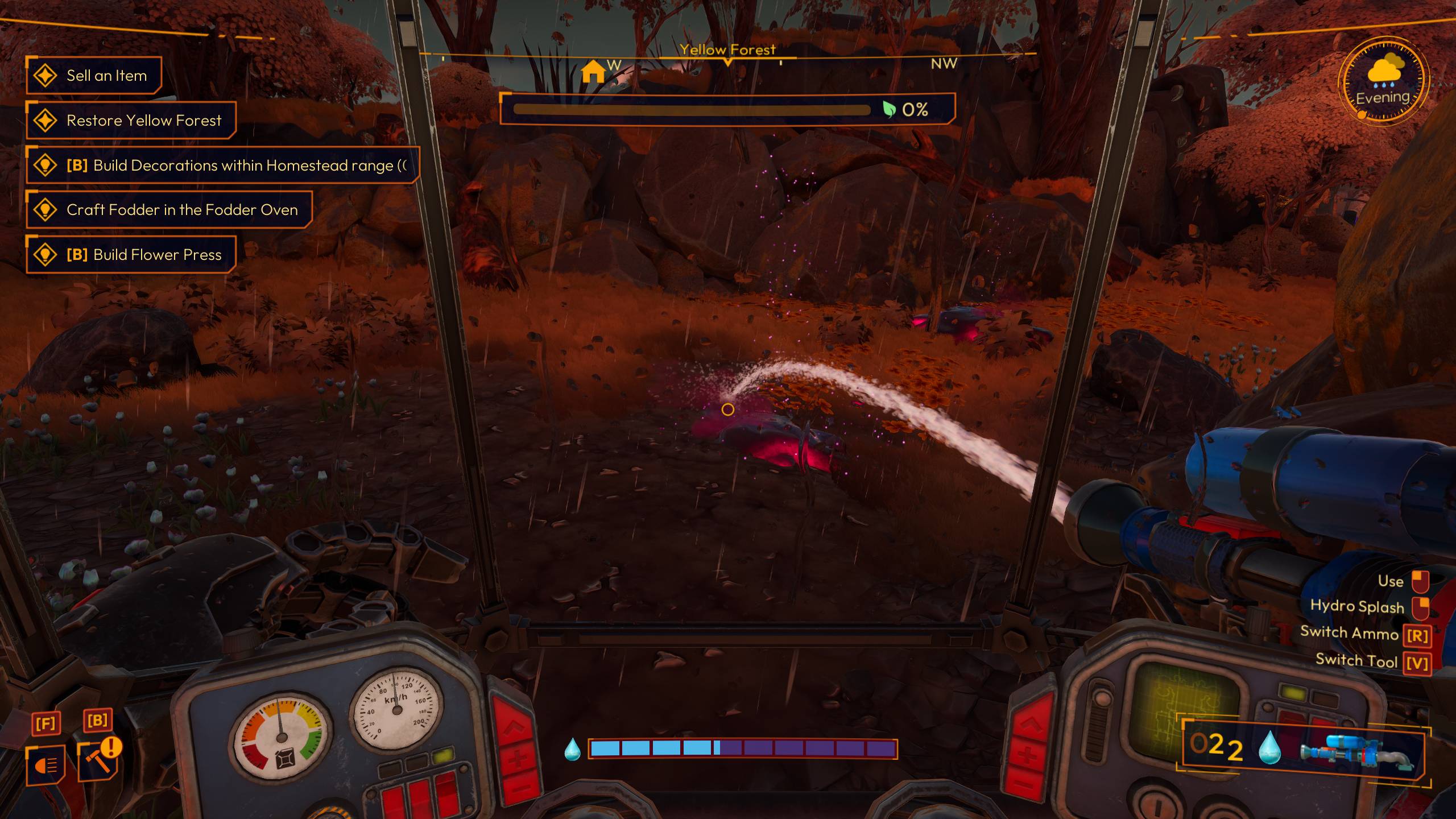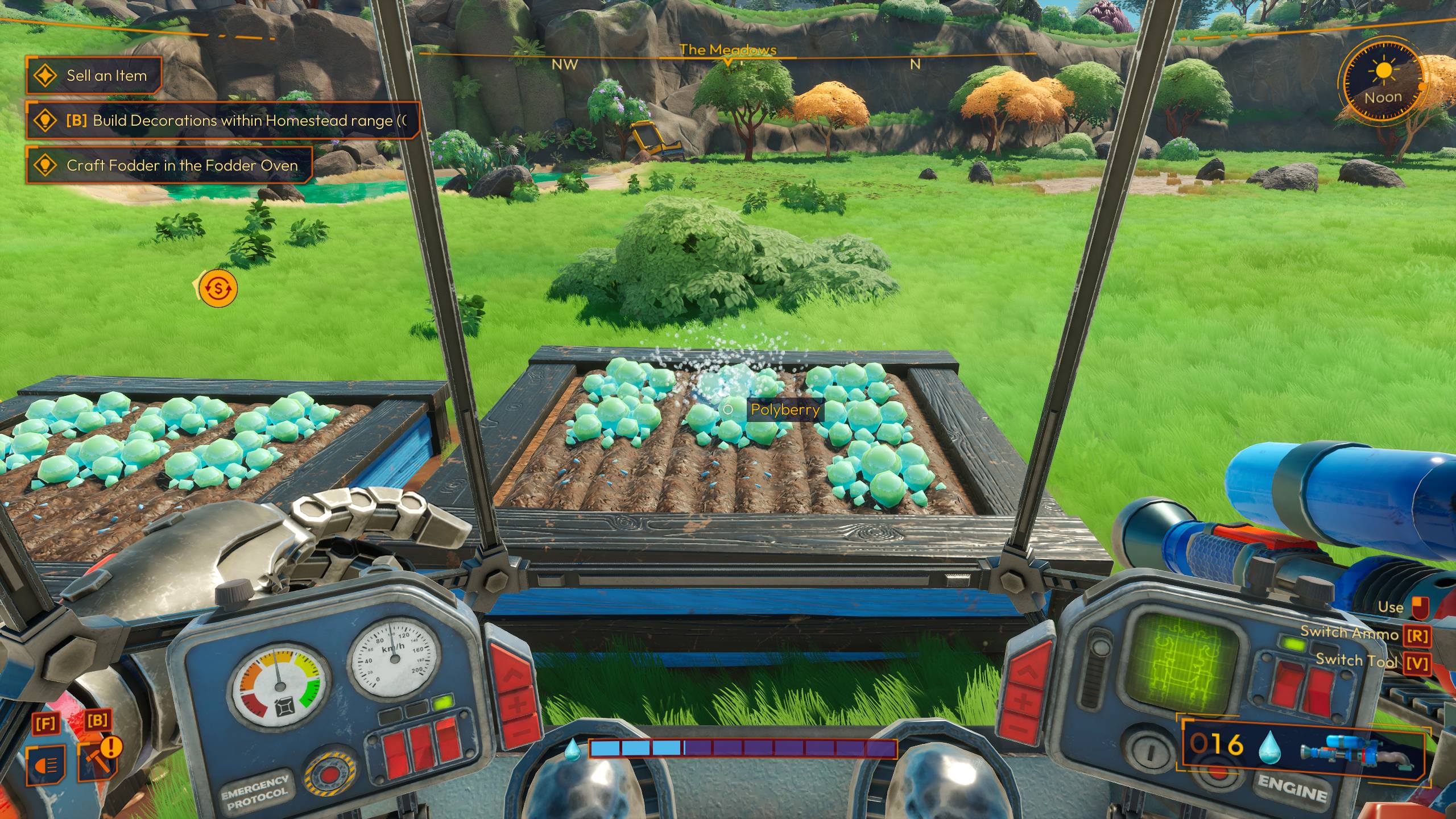 Frontera de Lightyear Los mechs añaden un toque interesante a la idea de la agricultura fronteriza, y dependerás mucho de las diversas herramientas de tu mech. Esto incluye la sierra de púas para cortar árboles y romper rocas, la manguera de riego para regar cultivos y limpiar el entorno local, la cosechadora por vacío para absorber recursos y el tirador de semillas para plantar cultivos. Se recomienda encarecidamente que actualice estas herramientas primero.