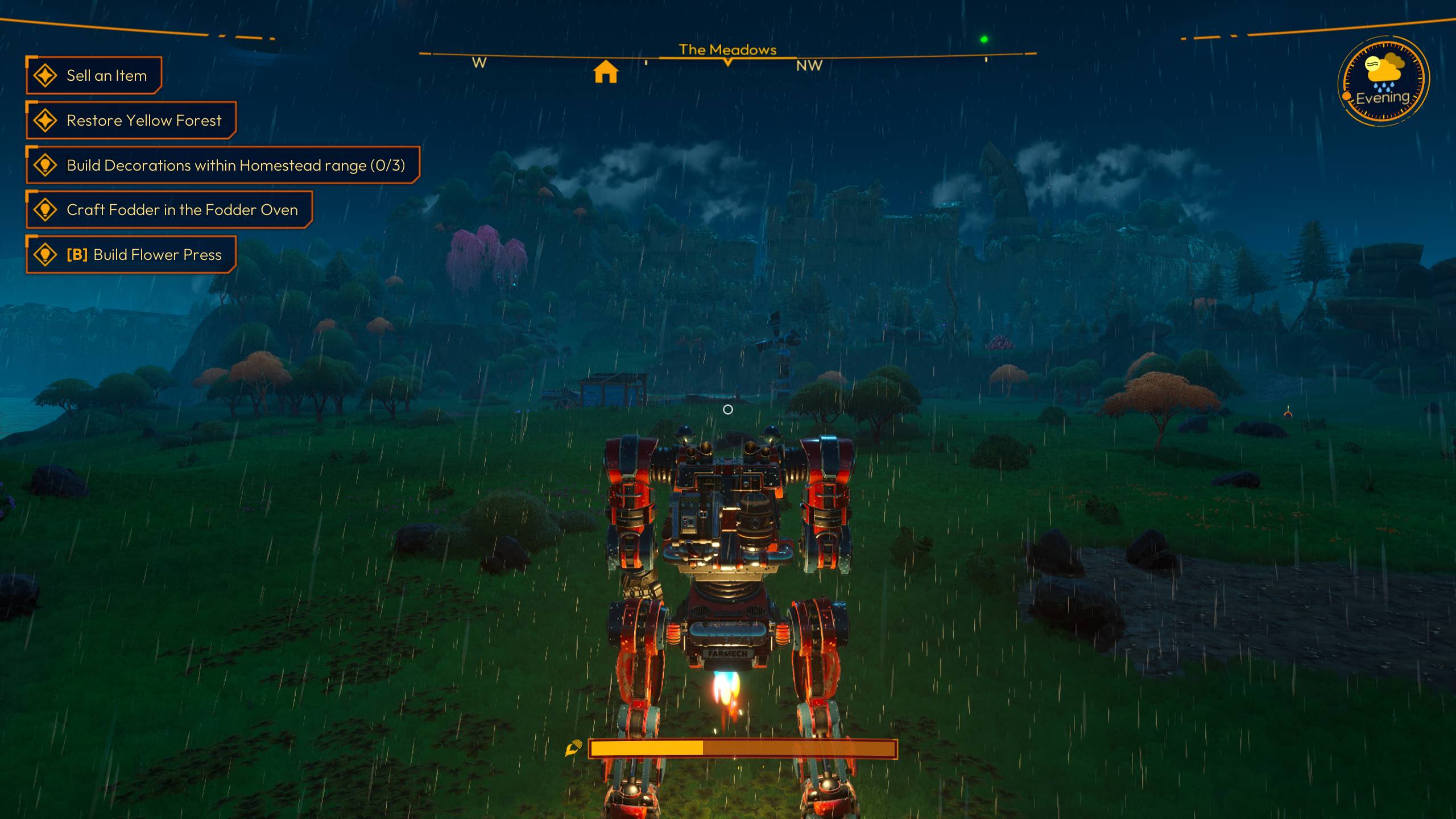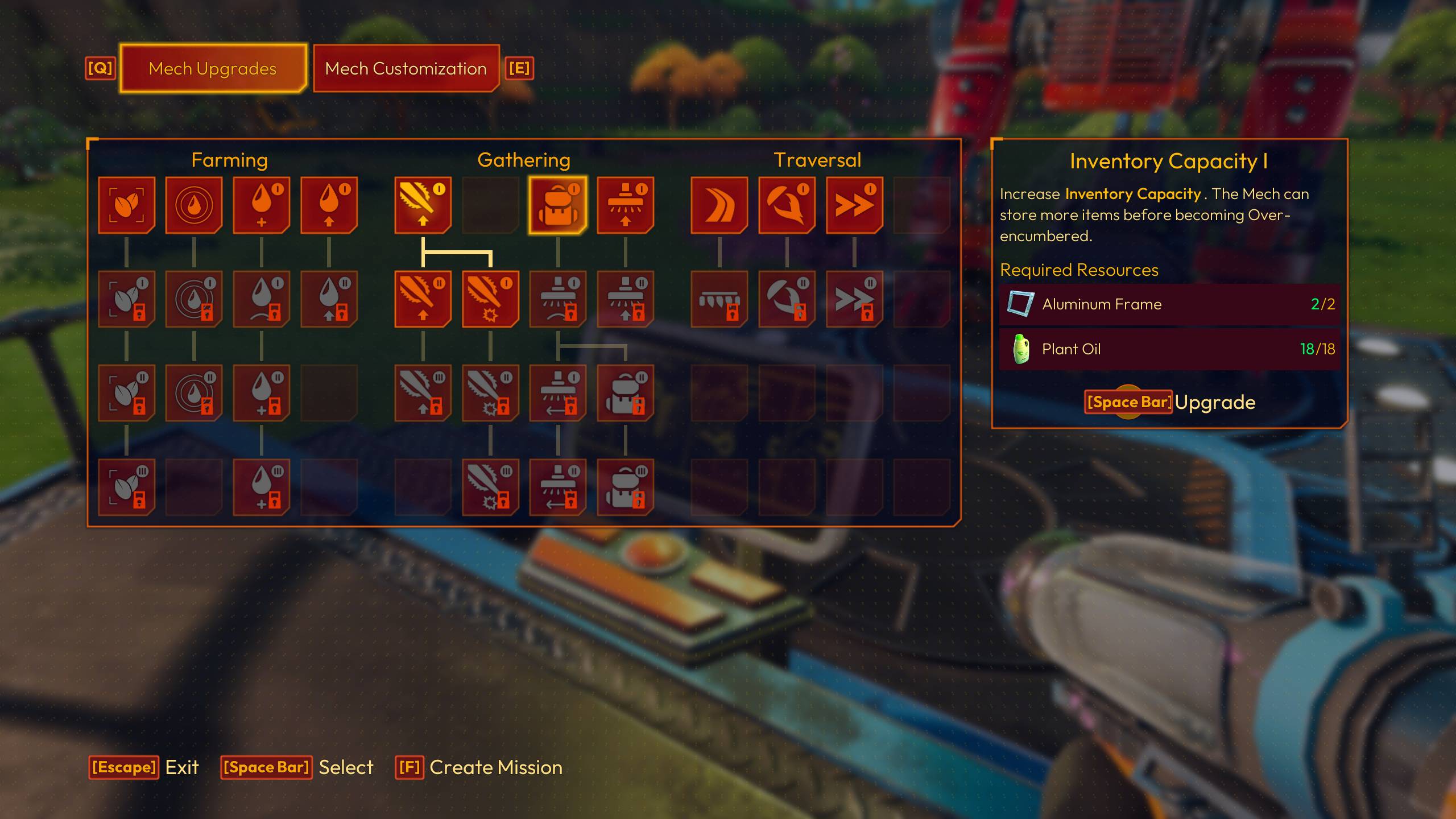 Para recolectar recursos para otras mejoras, equipos agrícolas y edificios, necesitarás explorar algunos biomas diferentes. La mejora Sprint Speed I es un aumento básico de la velocidad de movimiento que se aplica siempre y cuando tu mech no esté sobrecargado. Esta es una actualización esencial al principio del juego y casi siempre es útil cuando viajas fuera de tu base de operaciones para explorar, recolectar recursos o restaurar biomas planetarios.