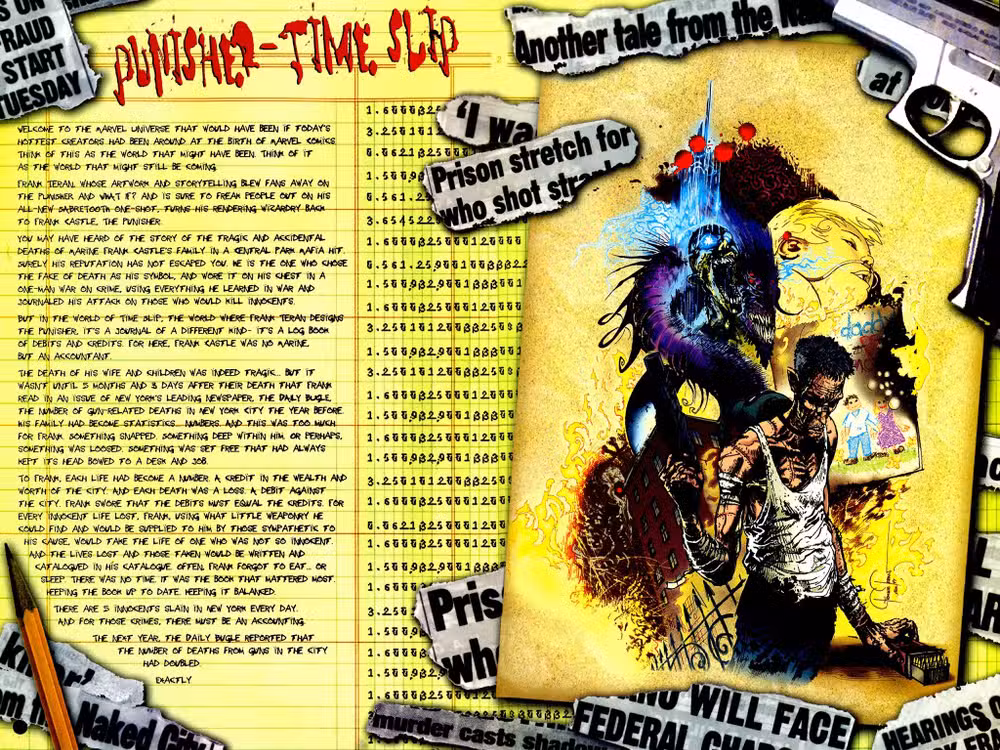 A principios de siglo, Marvel Timeslip invitó a algunos de los creadores de cómics más populares a reutilizar los personajes más importantes de la editorial, incluido Punisher. El artista Frank Teran llevó las tendencias psicopáticas inherentes de Punisher al límite con el Timeslip encarnación. Contador de profesión, Punisher aún perdió a su familia y libró una guerra contra el crimen.