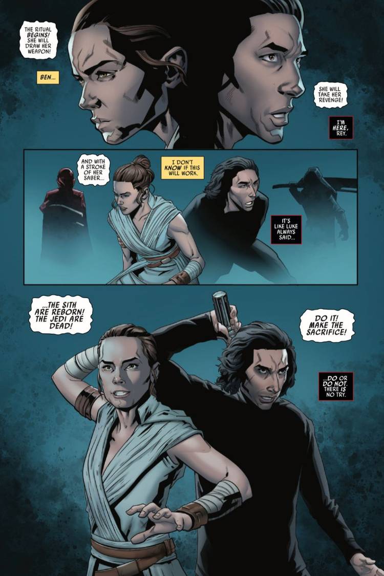 Uno de los momentos más divisivos en El surgimiento de Skywalker es cuando Ben se sacrifica para revivir a Rey, lo que lleva a un beso entre los dos antes de que muera y se convierta en uno con la fuerza. Curiosamente, El surgimiento de la adaptación de Skywalker #5 ve a Rey experimentar el alcance completo de la vida de Ben Solo como Jedi. No solo recibe los recuerdos del nacimiento de Ben a Han Solo y Leia Organa, sino también su entrenamiento bajo Luke con su Academia Jedi sobre Ossus.