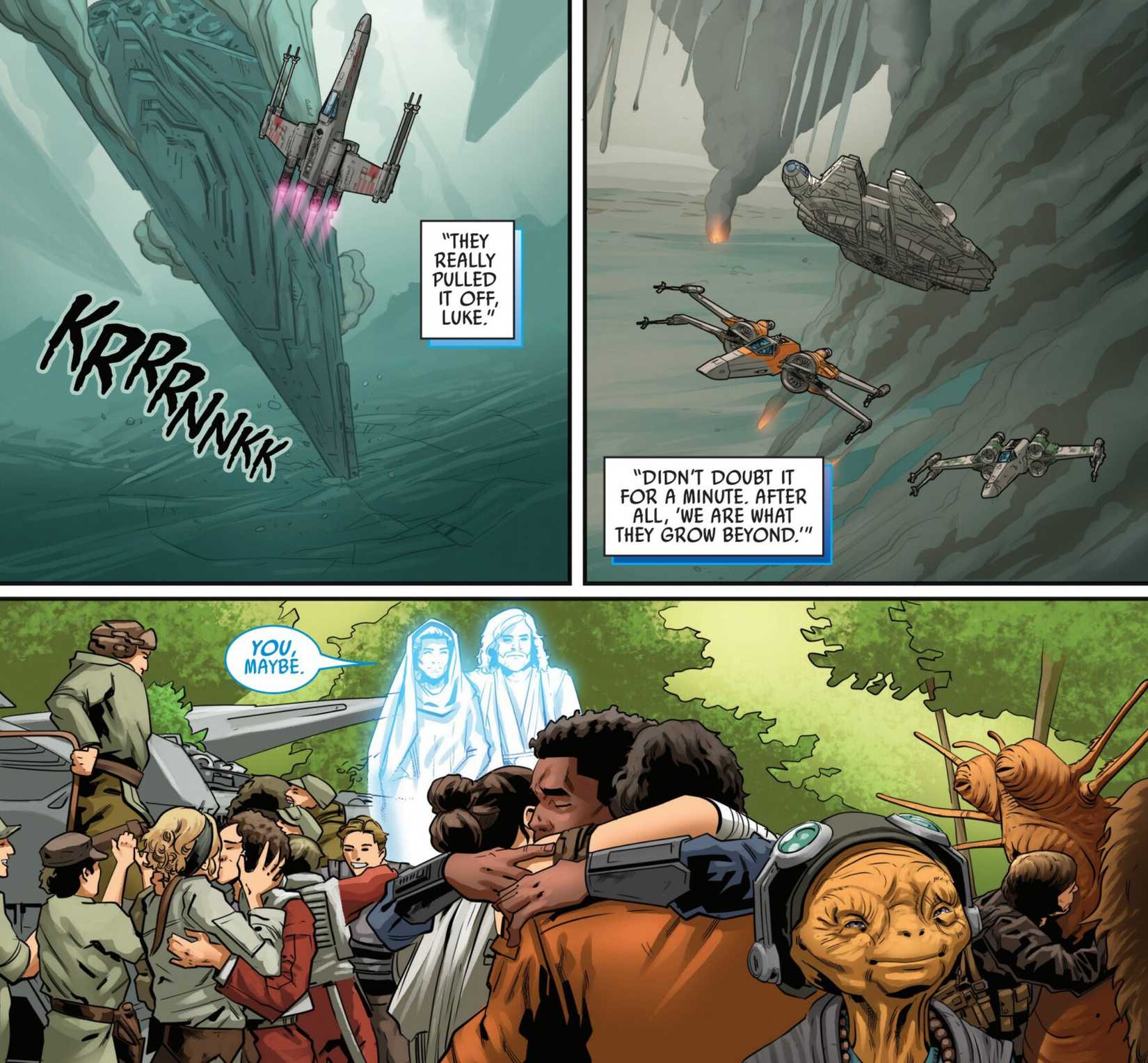 A raíz de la batalla de Exegol, El surgimiento de la adaptación de Skywalker #5 presenta un momento adicional durante las celebraciones de la resistencia en Ajan Kloss. Mientras Rey, Finn y Poe abrazan después de la victoria sobre Palpatine y su orden final, Luke Skywalker y Leia Organa se presentan cuidando la resistencia como fantasmas de la fuerza. Cuando Leia comenta que lo lograron, Luke vuelve a llamar a la línea de Yoda desde El último Jedicomentando que él y Leia son aquellos a quienes los héroes de la resistencia “crecen más allá” y nunca los dudaron.