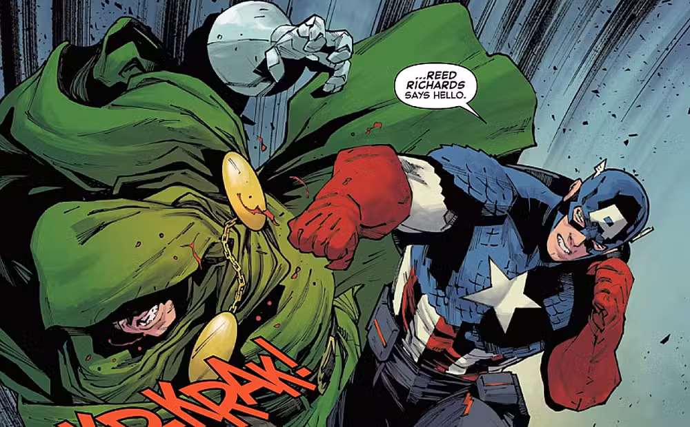En Capitán América #4, Steve Rogers y Doom se involucran en una confrontación 1 contra 1, que culmina con Rogers lanzando un fuerte gancho de derecha a la cara del dictador de Latveria, en un eco directo del golpe que le asestó a Hitler. Sin embargo, las circunstancias que rodean el golpe de gracia que el Capitán América propina en este número son significativamente diferentes.