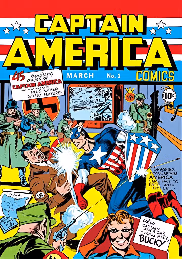 la portada de Cómics del Capitán América El número 1 hizo que la postura antinazi de Timely fuera inequívoca. El éxito del tema convirtió al Capitán América en un ícono, al mismo tiempo que señaló que muchos estadounidenses compartían la opinión de que era necesario noquear a Hitler. Fue un momento que ayudó a definir la empresa que luego se convertiría en Marvel.