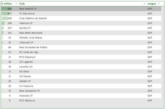 Según, ‘Transfermarkt, por su parte, sólo hay cinco clubs de la Liga cuya tasación global es superior a la de la Real Sociedad. Son el Real Madrid (1.180 millones de euros), el Barcelona (1.115), el Atlético (819,40), el Valencia (467,40) y el Betis (296,60). Por detrás de la franquicia guipuzcoana (293,30 millones), están el Sevilla (263,2), el Athletic (221,80) y el Celta (221,80). A tenor de las valoraciones de esta página especializada, los realistas más valiosos son Oyarzabal, tasado en 50 millones de euros, Willian