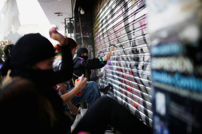 Colombia, Bogotá. Mujeres realizan pintas en comercios como parte de su manifestación por el Día Internacional de la Mujer.