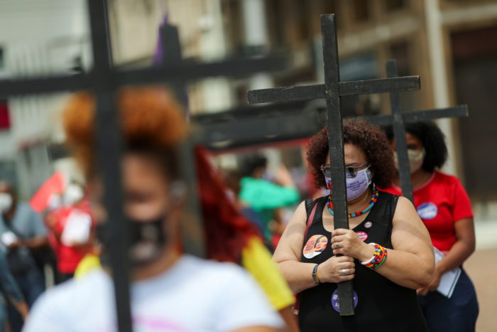 Brasil, Sao Paulo. Mujeres sostienen cruces negras en forma de protesta contra las muertes por feminicidios.