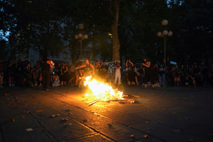 Paraguay, Asunción. Activistas incendian un letrero con la palabra patriarcado’.