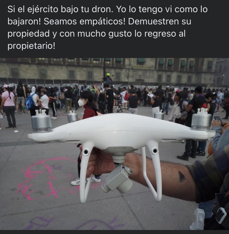 Al menos un dron fue encontrado durante la manifestación en el Zócalo. En Twitter, un usuario reportó haberlo recuperado y avisó a su propietario que lo mantendría bajo su cuidado.