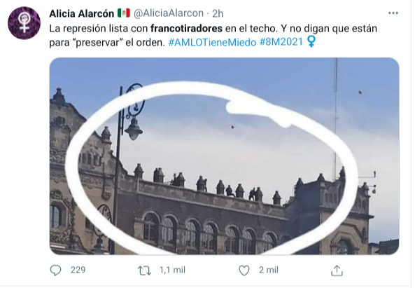 Durante la concentración de contingentes feministas frente a Palacio Nacional, usuarios de redes sociales denunciaron la presencia de personas armadas en la azotea del recinto federal.