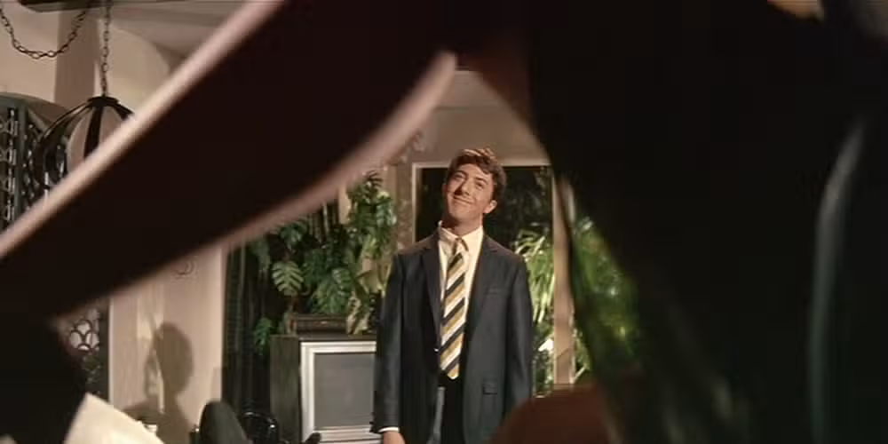 La toma de Dustin Hoffman enmarcada por la pierna de Anne Bancroft es el momento más emblemático de la historia del cine erótico. También es cuando dice la frase más citada de la película, “Señora Robinson, está tratando de seducirme. ¿No es así?”, que se ve privado de su confianza cuando se cita erróneamente como “Señora Robinson, ¿está tratando de seducirme?”