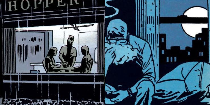 Es una especie de enfoque minimalista que no enfatiza el detalle de cada músculo ondulado, pero se siente como en casa en este mundo mugriento. Aún más lo es la forma en que Mazzucchelli da vida a Gotham City, combinando personajes con el escenario de manera efectiva para sentirse como un drama criminal de la década de 1950 que se actualiza con florituras modernas.
