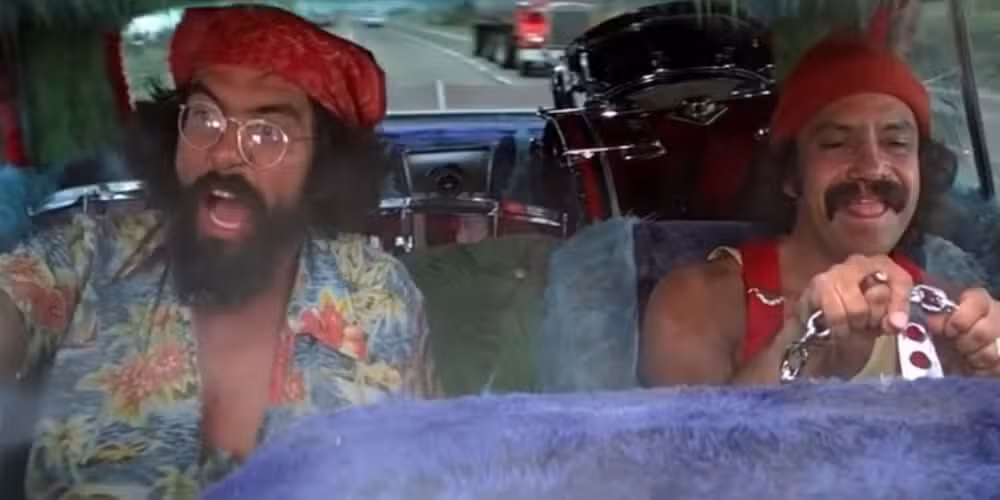 Pedro cree hilarantemente que el hombre es una mujer atractiva, y casi se estrella mientras se da vuelta, Pero los dos forman rápidamente un vínculo a pesar de esto y luego comparten una articulación cómicamente grande. Las películas de Cheech y Chong son conocidas por su humor stoner y el comienzo de En humo es una representación brillante de su tipo de comedia.
